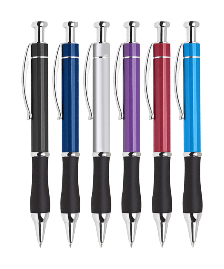 A bold, modern retractable aluminum ballpoint pen featuring a vibrant colored barrel, comfortable black rubber grip, and polished chrome trim.